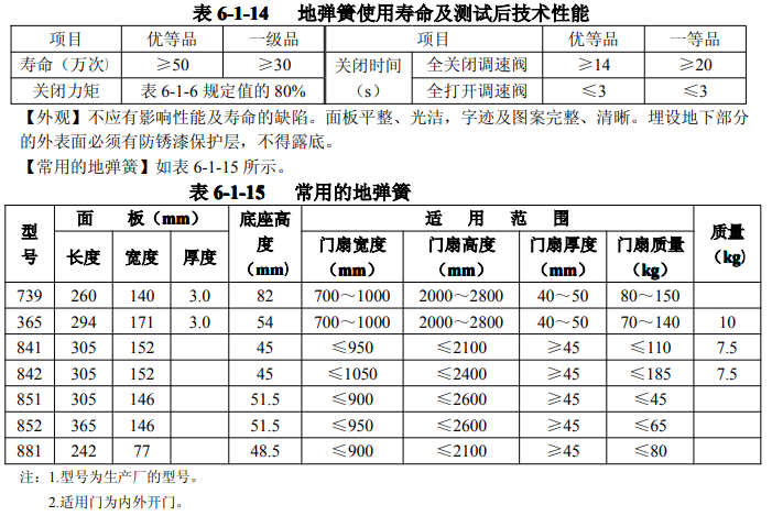 當(dāng)門扇開(kāi)啟角度小于 90°時(shí),放開(kāi)門扇,彈簧開(kāi)始伸張,將活塞向反向推移,再通過(guò)凸輪軸使門扇向關(guān)閉方向移動(dòng);在此同時(shí),進(jìn)油孔的單向閥關(guān)閉,緩沖油只能從排油孔回流,旋轉(zhuǎn)排油回路上的調(diào)節(jié)螺釘,可控制油量的多少,順時(shí)針旋轉(zhuǎn),排油回路間隙小,回油量少,門扇回轉(zhuǎn)速度慢,逆時(shí)針旋轉(zhuǎn),排油回路間隙大,回油量多,門扇回轉(zhuǎn)速度快;將調(diào)節(jié)螺釘旋轉(zhuǎn)在適當(dāng)?shù)奈恢蒙希梢缘玫剿枰拈T扇關(guān)閉速度,從而達(dá)到緩沖自動(dòng)關(guān)閉門扇的目的。使用壽命及測(cè)試后技術(shù)性能如表 6-1 -1 4 所示。